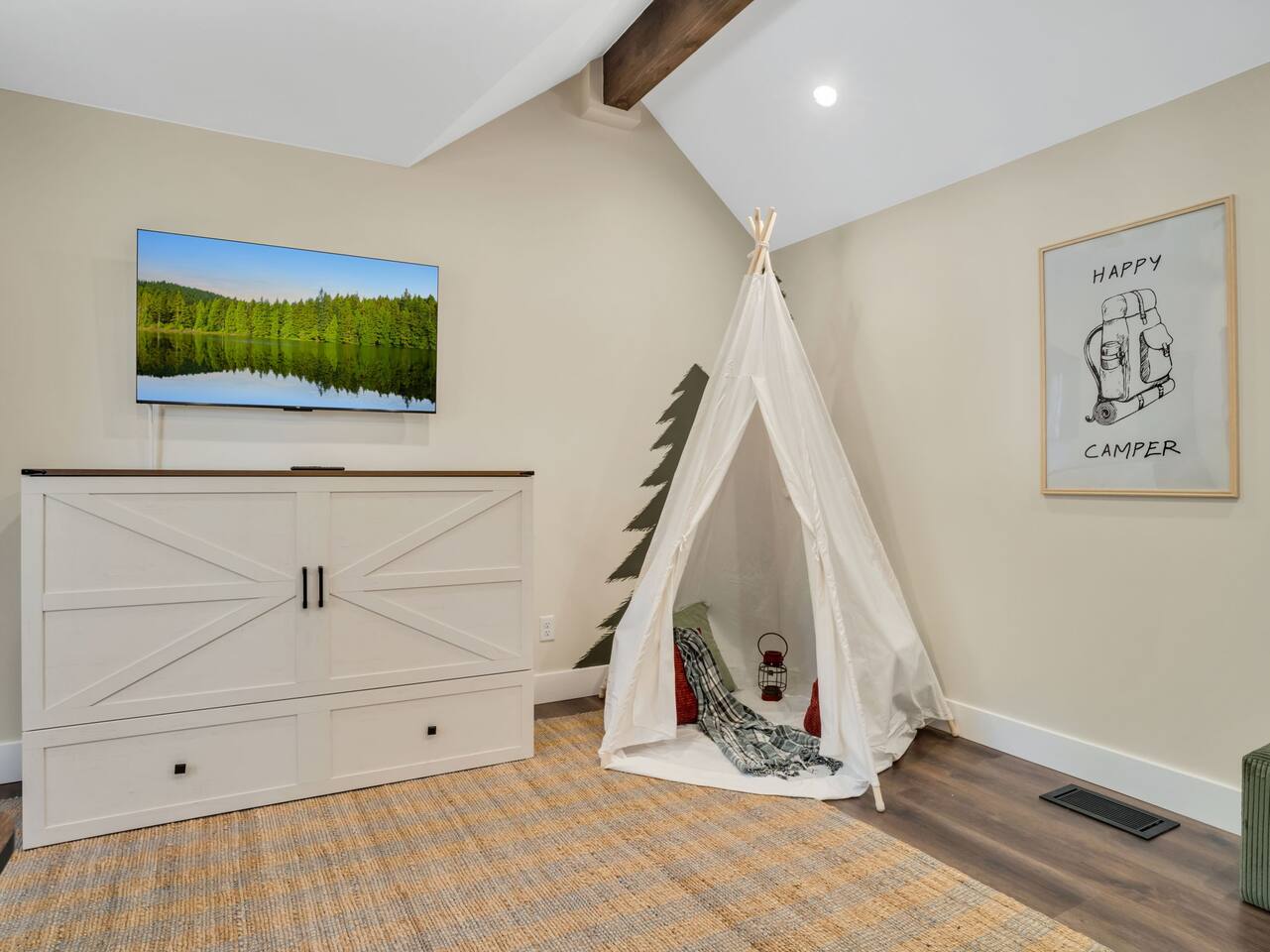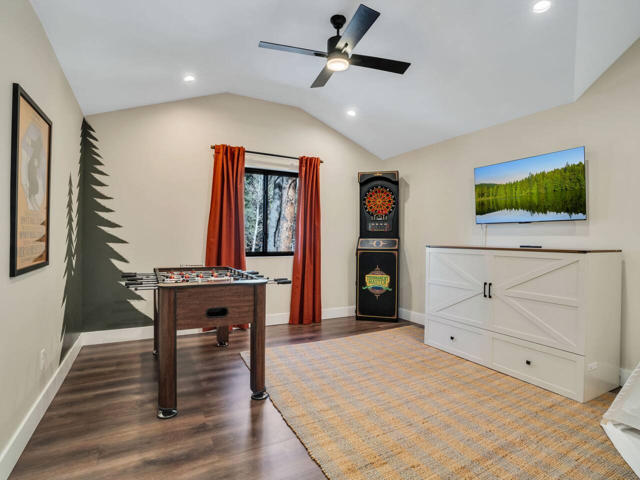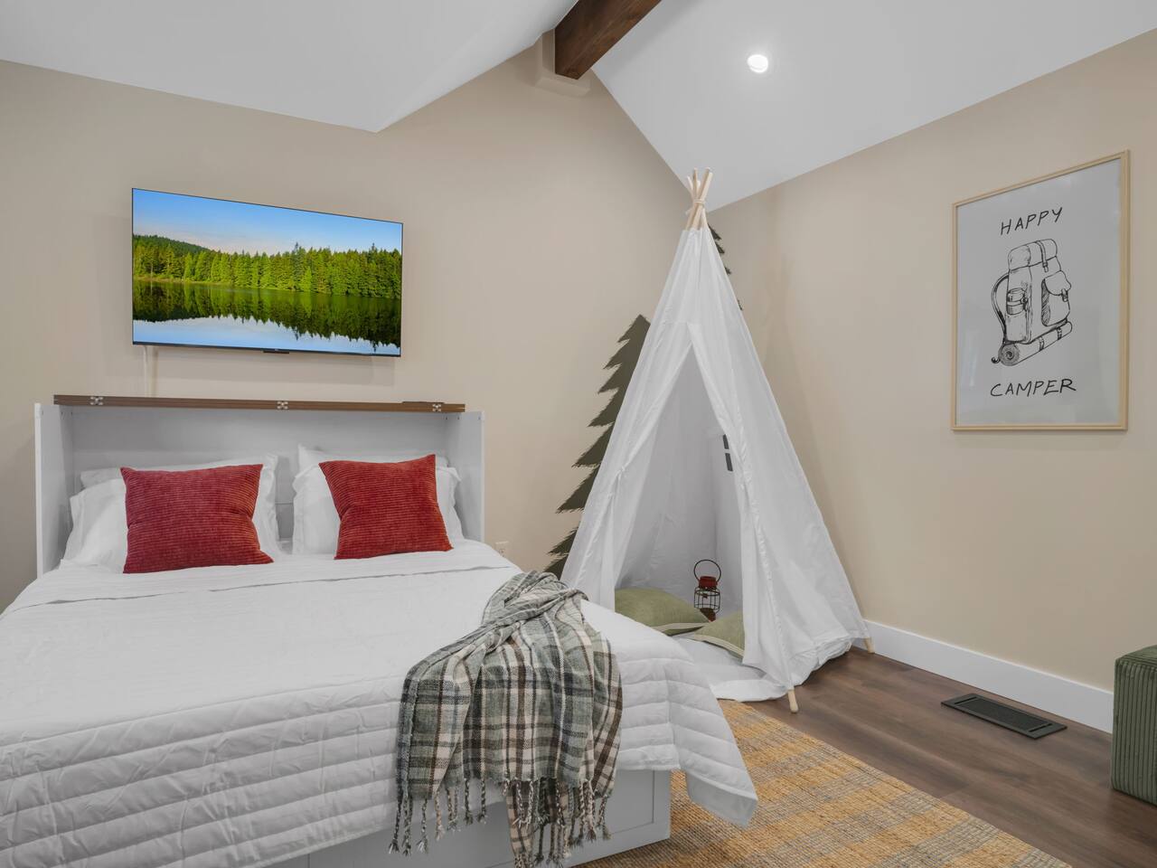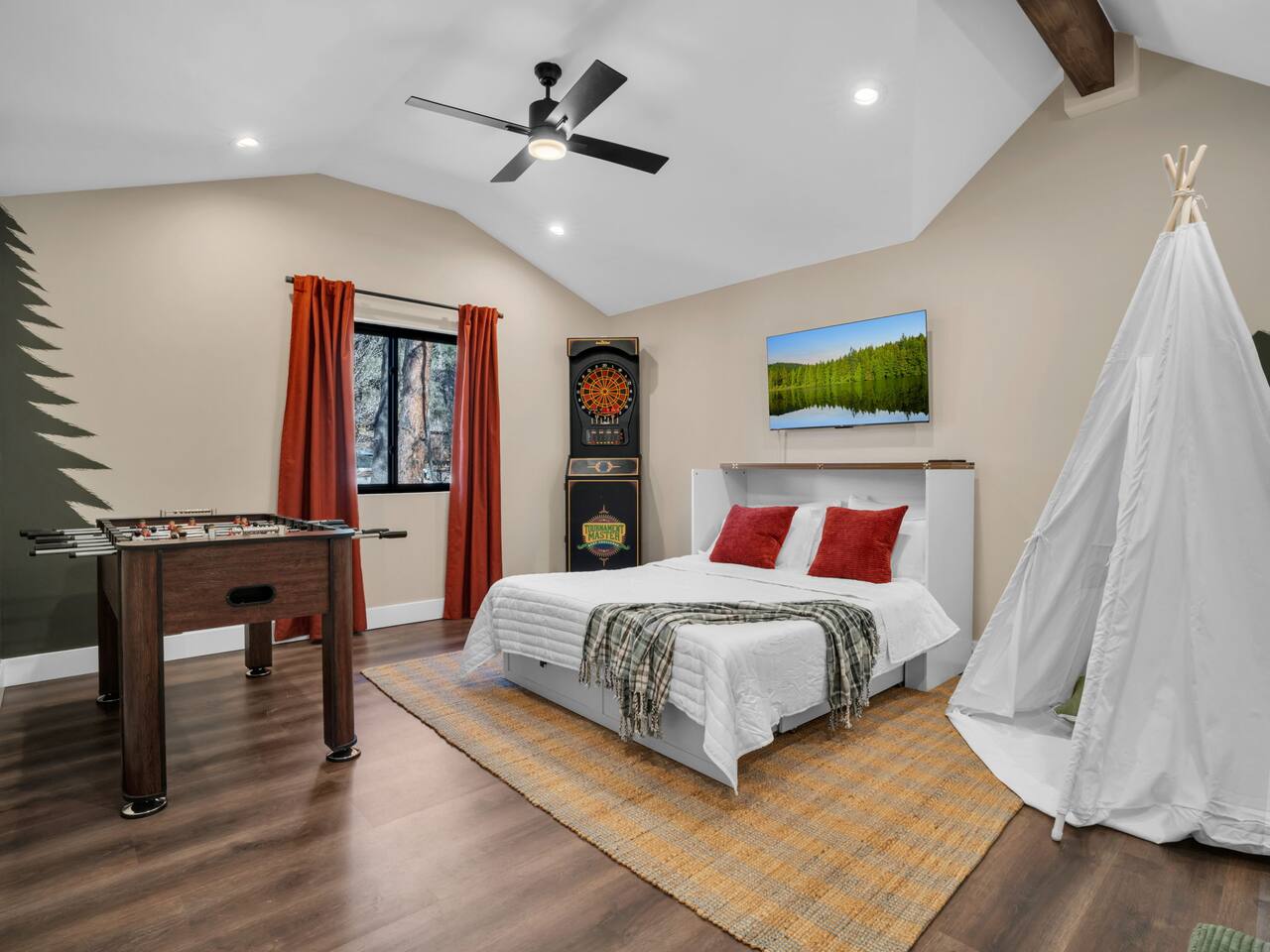 ⭑ Bedrooms ⭑ ↪ Four beautifully appointed bedrooms designed for relaxation and fun: ↪ Master’s bedroom features a comfy queen bed and a dedicated workspace for when you need to catch up on emails. ↪ Bedroom 2 doubles as a game room with a Murphy queen bed, teepee hut, foosball, arcade games, and a TV. ↪ Bedroom 3 is equipped with two queen beds, perfect for friends or family. ↪ Bedroom 4 has plush queen bed and room darkening shades. ⭑ Bathrooms ⭑ ↪Two full bathrooms ↪ Bathroom 1 includes a luxurious his and hers sink and a bathtub for soaking after a long day. ↪ Bathroom 2 comes with a convenient shower. ↪ Stocked with hygiene essentials and fresh towels for your convenience. ⭑ Full Kitchen ⭑ ↪ Modern kitchen island with bar seating for 2, ideal for a quick bite or morning coffee. ↪ Fully equipped with modern appliances to make cooking a breeze. ↪ Ample storage space and a dedicated coffee station for all your culinary needs. ↪ Enjoy making smores with our ready-to-use smores kit! ⭑ Living Room ⭑ ↪ Enjoy the spacious open floor plan that seamlessly connects to the dining area and kitchen—perfect for family gatherings. ↪ Relax on our plush couch while catching your favorite shows on the TV. ↪ Have fun with an array of board games available for your entertainment. ↪ Large windows equipped with room darkening shades for your comfort. ⭑ Dining Area ⭑ ↪ Cozy dining table for 6, complete with a lovely table setup. ↪ Positioned perfectly for watching the living room TV—never miss a moment of your favorite shows, even while dining! ↪ High chair available for the little ones. ⭑ Other Areas ⭑ ↪ Laundry area equipped with a washer, dryer, and iron to meet all your laundry needs during your stay ↪ Guests have access to a two car garage or free parking on the street
